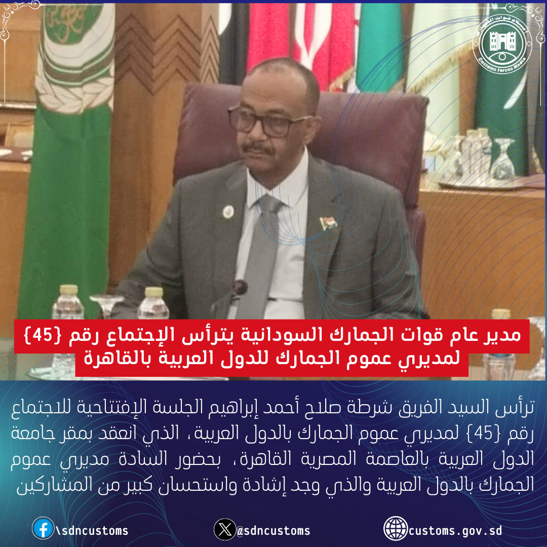 ترأس السيد الفريق شرطة صلاح أحمد إبراهيم الجلسة الافتتاحية للاجتماع رقم (45) لمديري عموم الجمارك بالدول العربية، الذي انعقد بمقر جامعة الدول العربية بالعاصمة المصرية القاهرة، بحضور السادة مديري عموم الجمارك بالدول العربية والذي وجد إشادة واستحسان كبير من المشاركين.