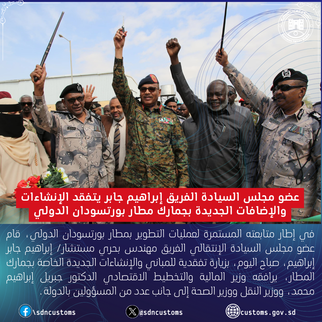 في إطار متابعته المستمرة لعمليات التطوير بمطار بورتسودان الدولي، قام عضو مجلس السيادة الإنتقالي الفريق مهندس بحري مستشار/ إبراهيم جابر، صباح اليوم، بزيارة تفقدية للمباني والإنشاءات الجديدة الخاصة بجمارك المطار، يرافقه وزير المالية والتخطيط الاقتصادي الدكتور جبريل إبراهيم إبراهيم، ووزير النقل ووزير الصحة إلى جانب عدد من المسؤولين بالدولة.
