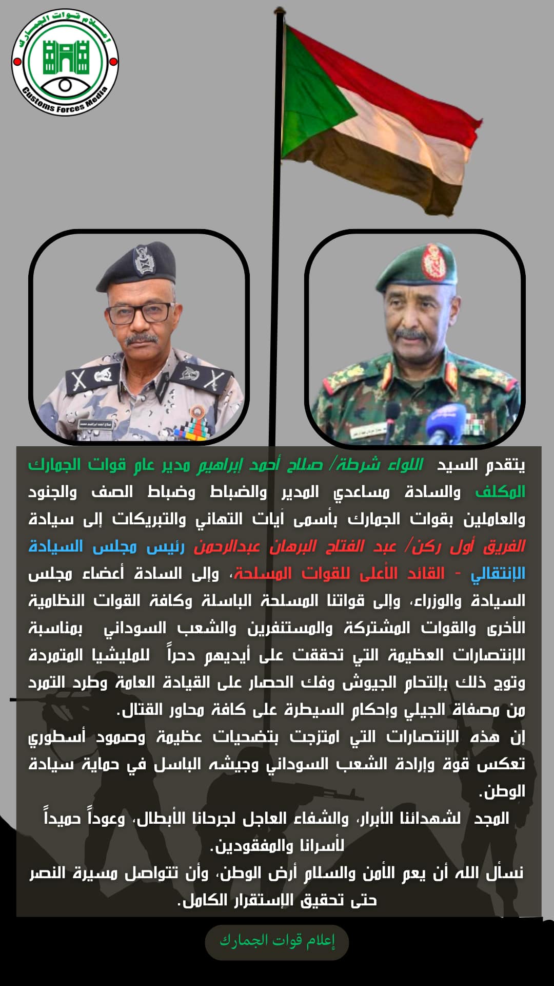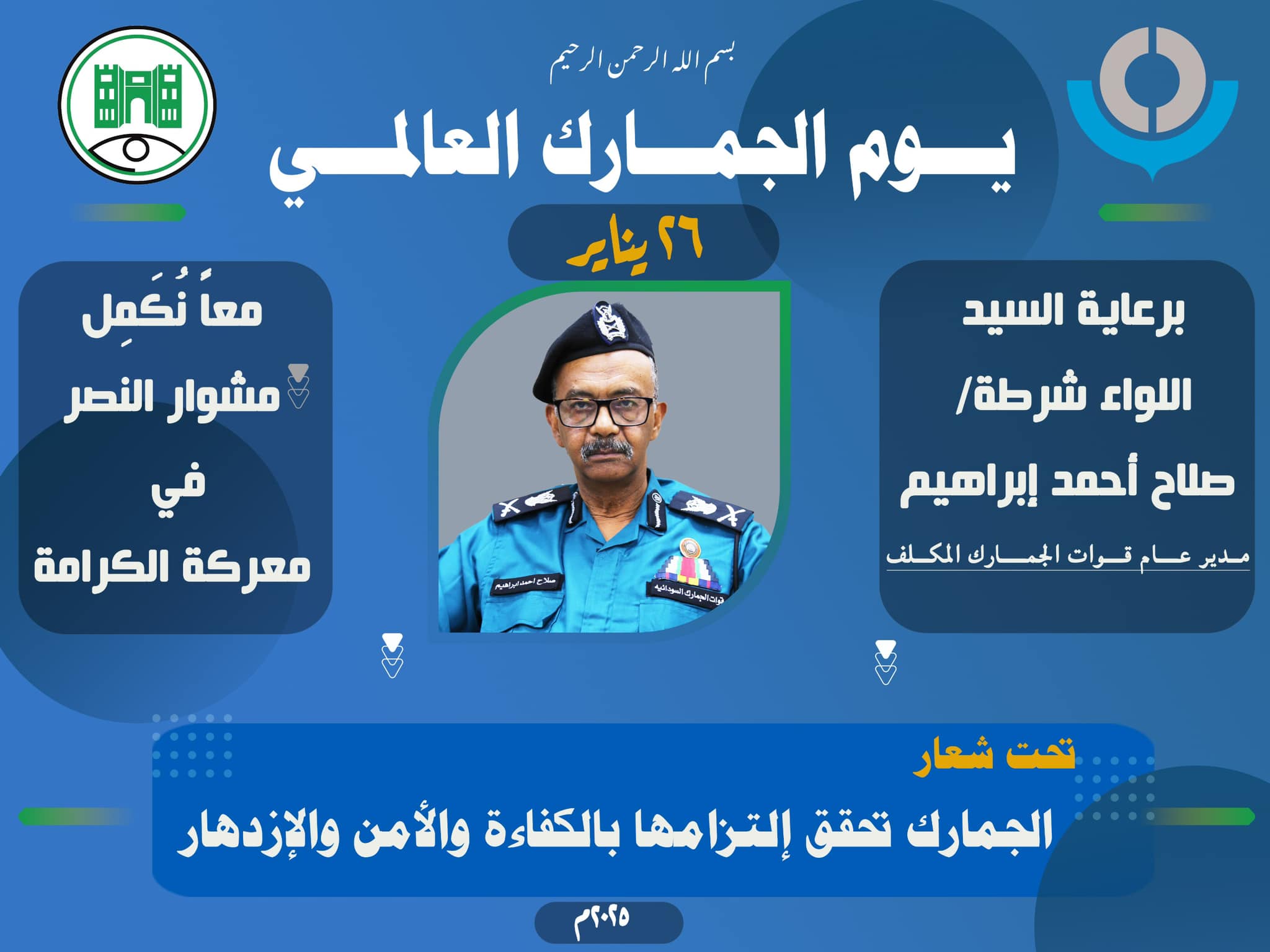 وأبان أن قوات الجمارك السودانية وهي تحتفل مع نظيراتها في كل دول العالم لديها مسؤليات جسام تستقبل بها العام الجديد مهتدية بما ارسته منظمة الجمارك العالمية شعاراً لهذا العام بتحقيق إلتزامها بالكفاءة المهنية وإكمال حوسبة جميع الإجراءات بشكل فعال وتعزيز كفاءة نظام إدارة المخاطر وتحقيق الأمن و مواجهة الأخطار الكبيرة التي طرأت وزادت بسبب الحرب وتدفق الأسلحة المهربة والمخدرات وموضحاً أن الجمارك ستقف سداً منيعاً أمام عمليات تهريب الآثار والموروثات الثقافية للشعب السوداني والمخطوطات الأثرية فضلاً عن مكافحة عمليات غسل الأموال والجرائم العابرة الحدود كما انها ستضع الإزدهار الذي يمثل الهدف الأسمى للبلاد وقوات الجمارك نصب أعينها.