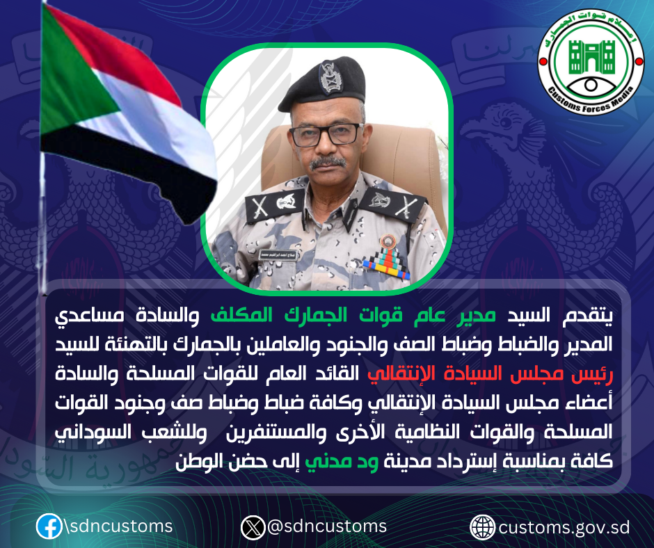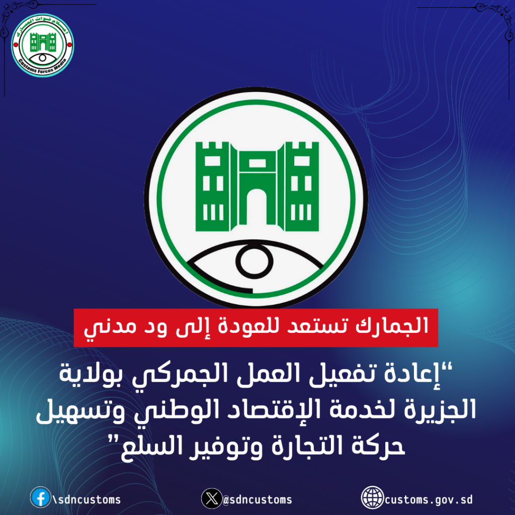 الجمارك تشرع في الترتيب لمباشرة عملها بولاية الجزيرة بعد تحرير حاضرتها مدينة ود مدني